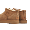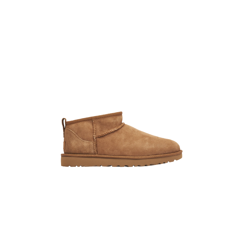 La UGG Classic Ultra Mini Boot Chestnut dévoile une empeigne en cuir couleur châtaigne surmontée de coutures épaisses qui articulent la cheville et renforcent le tout. Une languette à l'arrière du modèle facilite la mise au pied et accompagne le traditionnel branding UGG en cuir présent sur le talon.